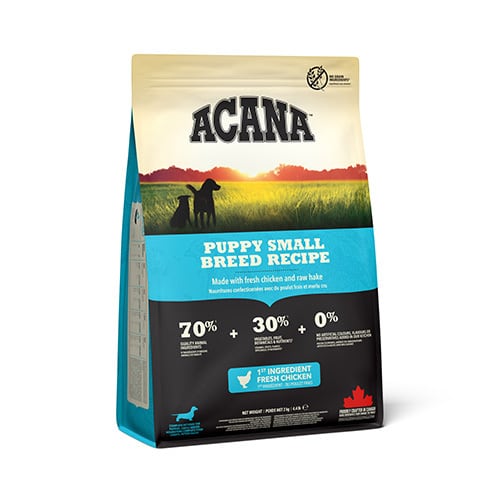 小型犬の子犬の成長に必要な栄養たっぷり!草原農場産の平飼い鶏肉、生ヘイクなど動物性タンパク質原材料を豊富に含んでいます。中・大型犬の子犬には粒が大きめなアカナ パピーレシピがおすすめです。