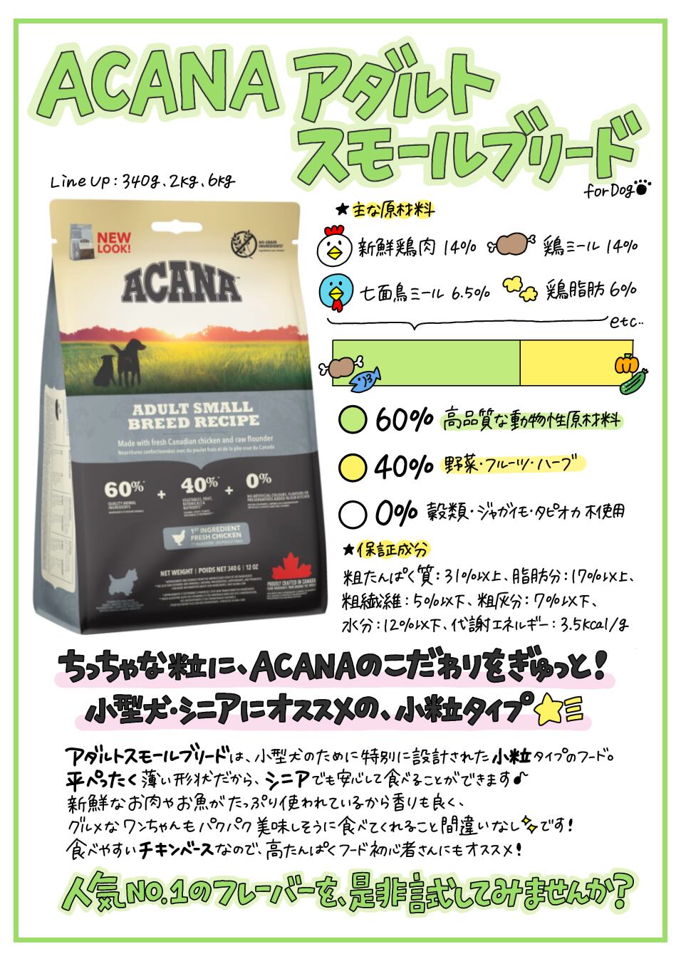 犬は身体の作りや必要な栄養素から見て“肉食”だと言われていますよね。アカナ アダルトスモールブリードレシピは、成犬の健康をサポートするために、地元農場産の平飼い鶏肉、生ヘイクなどの肉原材料がたっぷり!アカナの成犬用フードの中でもタンパク質・脂肪・カロリーが高いので、エネルギーを良く消費する活動量の多い活発なパートナーや少食のパートナーにおすすめです。高い肉含有量でパートナー(愛 犬)の強い身体作りをサポートします。