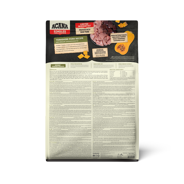 生豚肉 (18%), 豚ミール (18%), 丸ごとグリーンピース, 丸ごと赤レンズ豆, 生豚レバー (8%), 豚脂肪 (6%), 新鮮丸ごとバターナッツスクワッシュ (4%), 丸ごとヒヨコ豆, 丸ごと緑レンズ豆, 丸ごとイエローピース, レンズ豆繊維, エンドウ豆スターチ, 海藻 (EPAとDHAの供給源), 新鮮丸ごとカボチャ, 乾燥ケルプ, 塩, 丸ごとクランベリー, 丸ごとブルーベリー, 乾燥チコリールート, ターメリック, オオアザミ, ゴボウ, ラベンダー, マシュマロルート, ローズヒップ